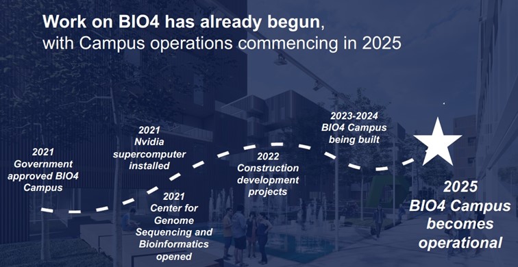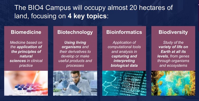 „БИО4“ кампус ће заузимати скоро 20 хектара земље, фокусирајући се на 4 кључне теме: Биомедицине - медицина заснована на примени принципа научних достигнућа у клиничкој пракси, Биотехнологије - коришћење живих организама и њихових деривата за развој или производњу корисних производа и процеса; Биоинформатике – примена рачунских алата и анализа за усвајање и тумачење биолошки података; Биодиверзитет - студије о разноврсност живота уопштено на нивоу земље, од гена преко организма и еко система.